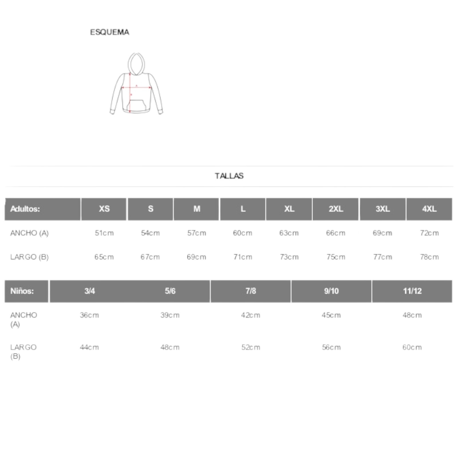 Adultos: XS · S · M · L · XL · 2XL